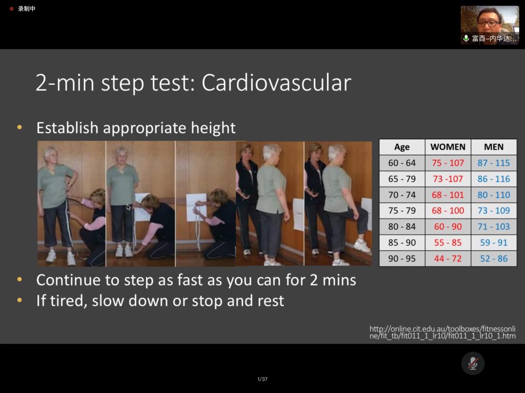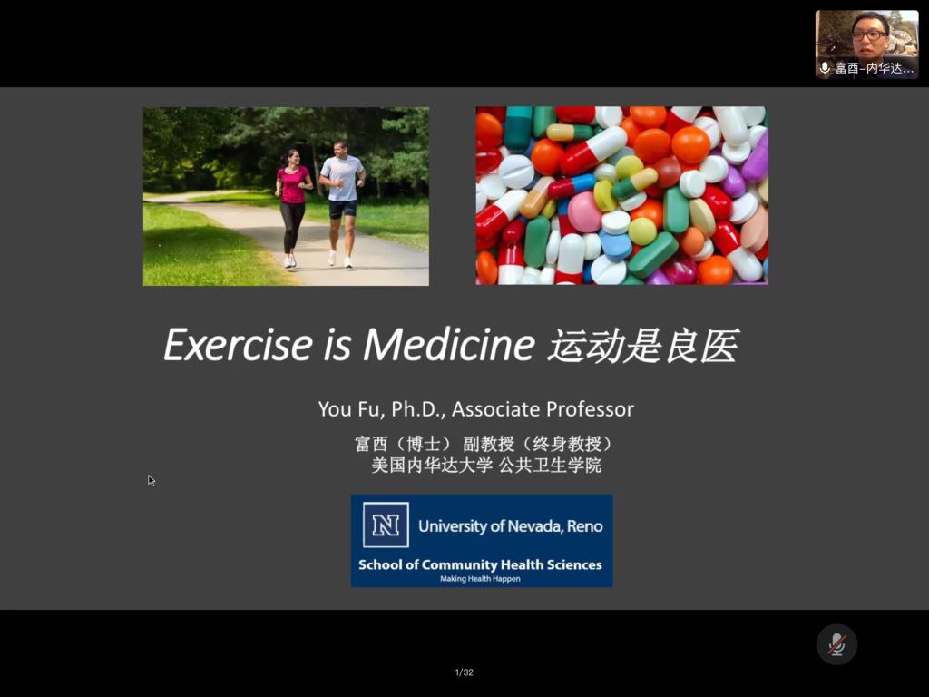 14日上午,美国内华达大学公共卫生学院富酉教授作了题为《运动是良医》的专题报告。为了让同学们更好的掌握本次报告的内容,富酉教授首先对Physical activity(体力活动)、exercise(体育锻炼)、physical fitness(体适能)等体育学核心概念进行了中外比较。如体适能主要内容为心肺有氧耐力,身体成分,肌肉力量,肌肉耐力、柔韧等。接着,富教授围绕“运动是良医”这一讲座主题,从古今中外的视角,分析了运动锻炼与人体健康之间的关系,并以大量的研究数据和现象论证了体育锻炼对身体健康是有益的的基本判断。随后,富酉教授介绍了运动处方的原则、内容及组成,并对各部分内容进行了详细的阐述。最后,他举例将60-94岁的老年人划分为7个组别进行高级健康测试以评估他们的功能性适合度,并以全面、安全、有效、因人而异的原则为他们制定相应的运动处方。