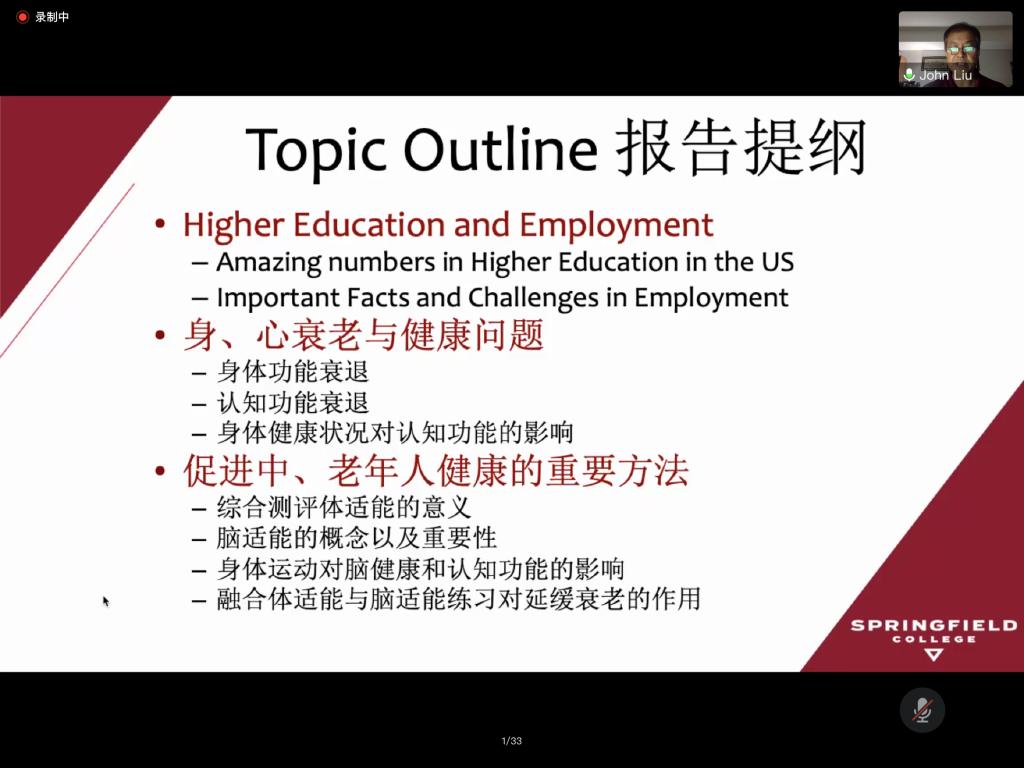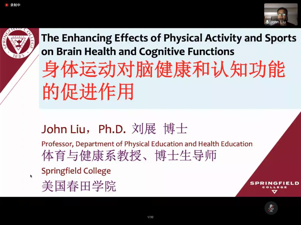 15日上午,美国春田大学体育和健康系终身教授刘展教授作了题为《身体运动对脑健康与认知功能的促进作用》的主题讲座。首先,刘教授通过数据统计向学员们呈现了美国高校各学科毕业生的就业形势,剖析了影响就业的各类影响因素,提出高等教育应注重培养学生的软、硬技能与核心竞争力的观点。随后,刘教授以身心衰老与健康问题为主题,通过引用高质量的国内外相关研究,从身体功能衰退、认知功能衰退以及身体健康状况对认知功能的影响三个模块内容进行讲解。最后,他从综合测评体适能的意义、脑适能的概念与重要性、身体运动对脑健康与认知功能的影响以及体脑适能结合练习对延缓衰老的作用几个方面阐述了促进中老年群体健康的重要方法。刘教授以生动形象的语言将理论与生活实际相结合,有效调动了学员们在个体健康与学术研究等层面的思考。在提问答疑环节,参与讲座的师生积极踊跃地向刘展教授请教脑适能领域研究、体能训练、中老年及特殊群体运动干预研究等领域的问题,刘教授在详细解答的同时,就中美在这些领域的研究工作及实践方式的异同也与师生进行了充分交流。