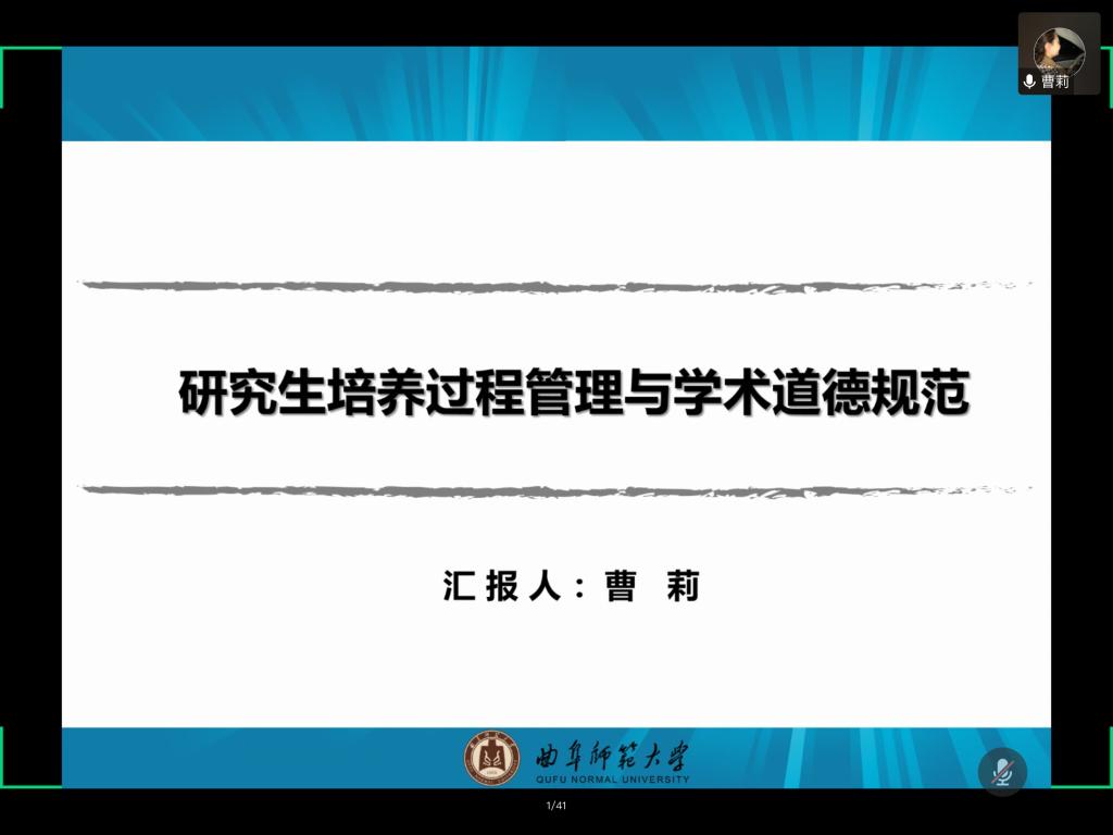 16日上午,曲阜师范大学体育科学学院院长曹莉教授作了《研究生培养过程管理与学术道德规范》的主题讲座。曹教授从选题的必要性、研究生培养过程管理、学术道德规范三个方面展开讲座内容。曹教授以曲师大研究生培养为例,表示学院应从研究生入学教育管理、研究生课程管理、研究生学位论文管理、论文进展检查与中期考核、论文查重、盲审前科研成果要求、盲审、答辩后学院学位分委员会审核等九部分内容对研究生的培养过程管理与学术道德教育严格把控。随后,她传授了三条曲师大学术道德教育经验:将学术道德教育融入研究生入学教育;出台学术不端行为分类实施细则;明确研究生学术不端行为处罚力度。最后,曹教授总结了曲师大研究生培养过程管理与学术道德特色:论文撰写“三级六层四审”制度、研究生课程“三级五类三结合”督查机制、研究生技能“两深化四建立四评比”、研究生思想政治教育“一结合三课堂四创新”等。