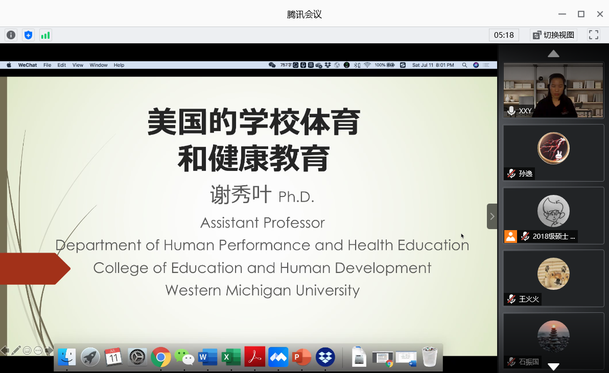 7月11日至12日,环球360会员登录2014届硕士研究生、美国西密歇根大学助理教授谢秀叶博士分别作了题为《留美经验分享》和《美国学校教育与健康体育》的专题讲座。在第一场讲座中,谢秀叶博士从学习经历、工作经验、生活经验、Q&A四个方面详细介绍了她的留美经历。她指出美国博士研究生教育注重综合能力的培养,即学习能力、沟通能力、领导力、抗压能力、时间管理能力,并着重介绍了沟通的重要性,并鼓励大家多参与重要会议,抓住锻炼机会。在第二场讲座中,谢秀叶博士从美国学校体育介绍、特色启示、健康教育授课内容主题、特色与启示等4部分展开,介绍了学校体育在小学、初中、高中、大学中所发挥的作用及学校体育课的日常开展。在美国学校体育教育9个特色中,谢秀叶博士谈到美国非常重视体育环境的安全问题,且从多维度、多样化、多形式的视角开展学生评价。围绕学校健康教育,谢秀叶博士带领大家了解了健康教育的理论构架,并学习了健康教育的8个标准,并以性教育、个人健康(口腔健康)为案例介绍了美国健康教育的教授内容,并强调了这两部分内容对学生来说的重要性。