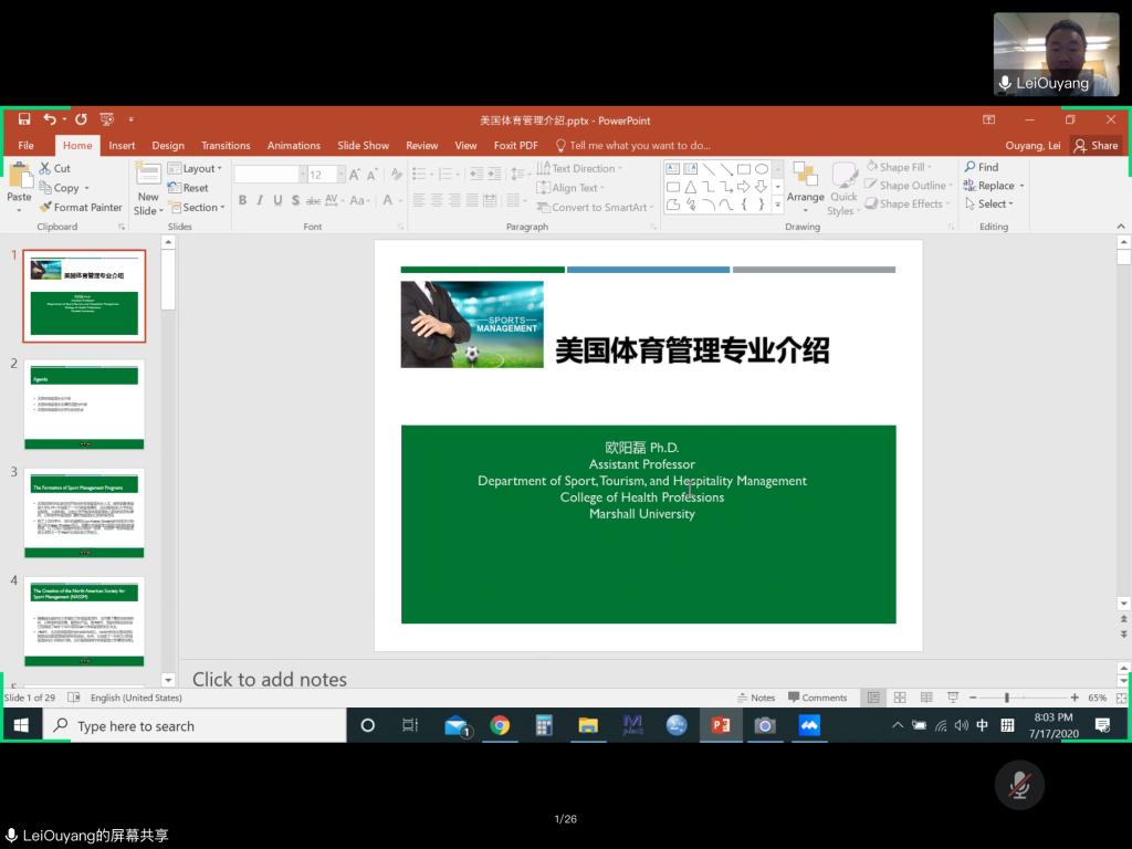 18日上午,环球360会员登录2009届本科生、美国马歇尔大学助理教授欧阳磊博士作了题为《美国体育管理介绍》的主题报告。他从美国体育管理专业介绍、课程设置与申请、学生就业机会三部分内容对美国体育管理进行介绍。其中,欧阳磊博士介绍了国外三个重要的体育管理学术会议:北美体育管理学会(NASSM)、体育市场营销协会(SMA)、应用体育管理协会(ASMA),并为大家展示和介绍了三个会议的官方网站、网站各个板块的作用、以及各会议的基本内容、投稿时间以及要求。随后,欧阳磊博士介绍了体育管理专业硕博研究生的课程要求,分别以UNC、MU、OSU三所学校为同学们详细介绍了每个学校的课程设置、学分要求、考试等。在学生就业机会部分,欧阳磊博士介绍到主要有三大就业方向:学校体育部门、职业体育、体育娱乐产业。随后,详细分析了这三个方向学生能够从事的职位、薪资等。在互动环节,2017级博士研究生车雯就留学读博费用、如何润色英文写作、在投稿内容的侧重点进行提问,欧阳磊对其提出的问题一一进行解答。随后,他与学员们就国内外投稿内容的侧重点进行讨论,他表示国外研究相较于国内属于聚焦到某一研究点,并就投稿选题等提出了自己的建议。