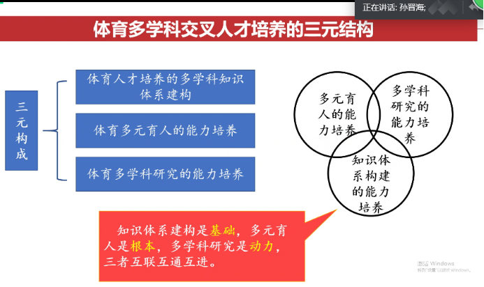9日上午举行了两场学术讲座。首先,孙晋海教授作了题《体育多学科交叉人才培养及研究思考》的讲座,他从体育人培养现状,到如何加强人才培养、体育多学科交叉人才培养的三元结构、体育专业学生多学科交叉能力培养方案等4部分入手,强调了多学科交叉能力的重要性,提出知识体系构建是基础,多元育人是根本,多学科研究是动力,三者互联互通互进的观点,并表示需要从源头培养、过程培训、内部促进、外部协同、制度保障等5个方面促进多学科交叉能力的提升。随后,崔丽丽教授作了题为《中西方体育文化比较:酒神、日神与道家、儒家》的讲座,从民族心理结构、中西方不同的“民族文化结构”、民族社会结构三个方面详细介绍了中西方体育文化之间的具体差异。营员通过两场学术讲座领略了环球360会员登录教授治学的广度和深度,并对学科发展有了进一步的了解,加深了营员对未来学习生活的认知水平。