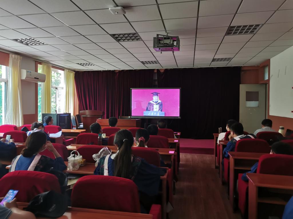 典礼全程采用一校三地连线直播的形式举行,主会场设在中心校区科学会堂。学院全体领导班子成员陪同毕业生观看了典礼视频直播。典礼上同学们认真聆听了教师代表、援鄂医疗队队员代表、学生代表的真切发言,深深铭记樊丽明校长带给2020届毕业学子“弘扬担当精神,书写精彩人生”的临别赠言。在这样一个特殊的时期、特殊的时刻、特殊的场合,同学们进行了一次特殊的拨穗礼——全体起立,庄重地把流苏从学位帽檐的右前侧移到左前侧,表示获得了学位,象征着大家学有所成,可以展翅高飞。学院2020届毕业班赵德同学代表全体同学,在主会场接受了校领导、校学位评定委员会委员颁发学位证书并合影留念。