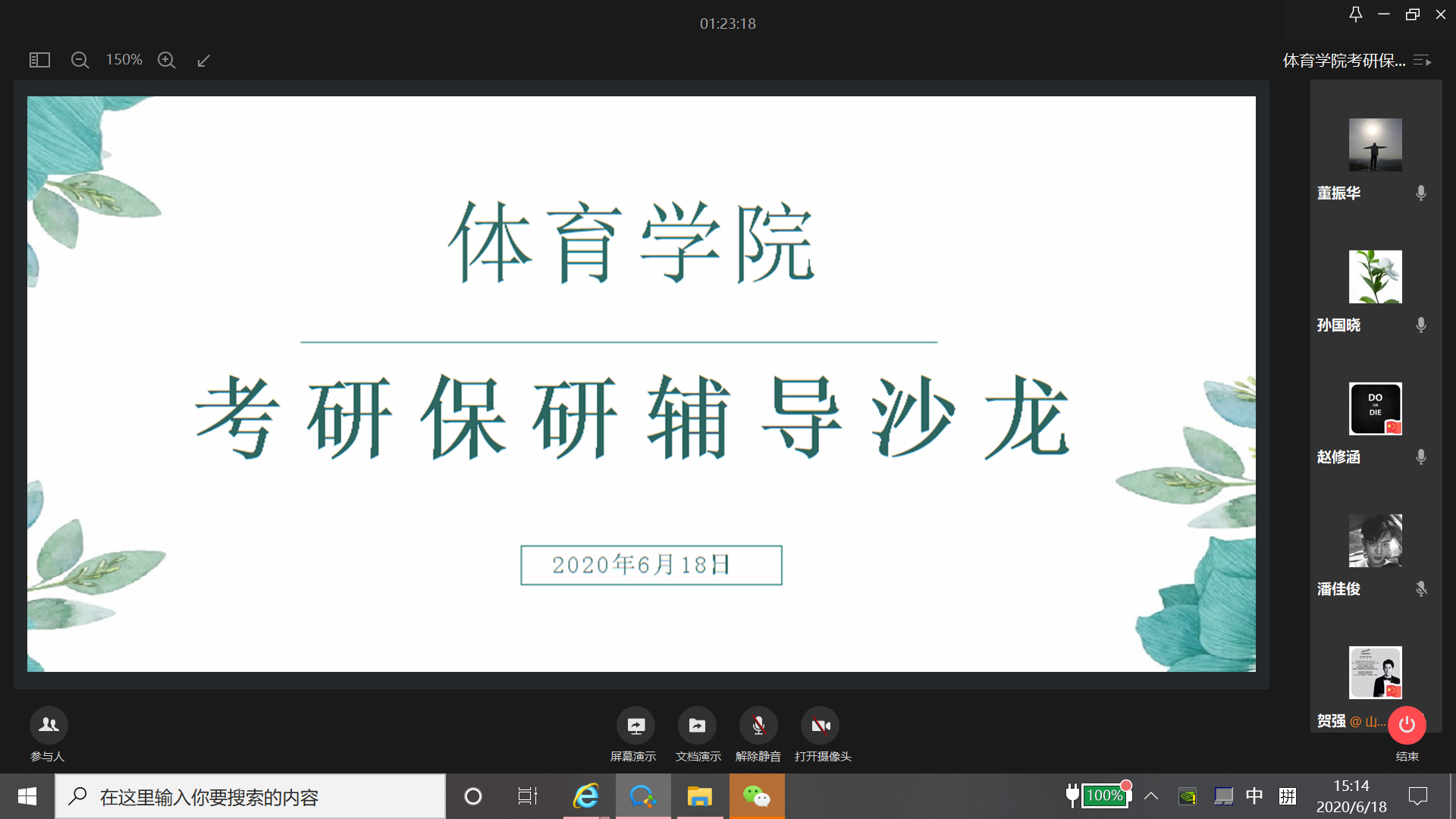 6月18日下午,环球360会员登录为有考研意向和保研可能的学生举办线上“考研保研辅导沙龙”,邀请了社会体育系贺强、李拓建、朱启莹、张宪亮、孙国晓、赵修涵等六位年轻优秀教师参加,学院党委副书记周庆华出席并讲话,沙龙由辅导员袁淑娟主持。