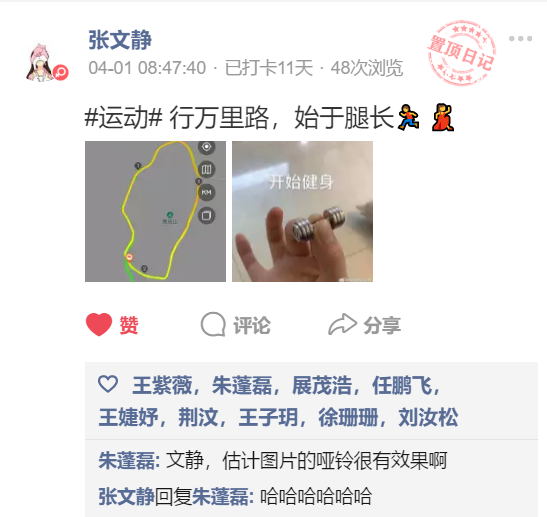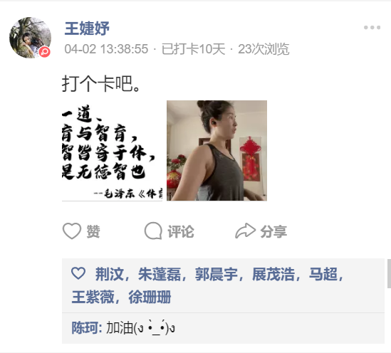 读书打卡活动进行过程中精彩纷呈,同学们不仅根据活动要求坚持打卡,还衍生了很多丰富有趣的内容,每天的打卡不仅仅是同学们对自律自省、积极充实自我的承诺的践行,还成为了很多同学“才艺”展示的舞台,同学们通过点赞、互动评论、设置挑战任务等方式相互激励、共同进步。在后续对参与者们进行活动感悟征集时,同学们也纷纷表达了对本次读书打卡活动的喜爱、不舍之情,认为此次读书运动打卡活动非常有效的促进了自己学习、运动、生活等方面良好习惯的养成,通过同学们之间的互相关注、互相激励收获良多,也有很多同学表示通过打卡活动也深刻体会到了大家虽不能返校学习但都仍能克服时艰、积极学习、自律自强的良好氛围,会继续通过类似打卡的方式将活动期间的良好习惯坚持下去。