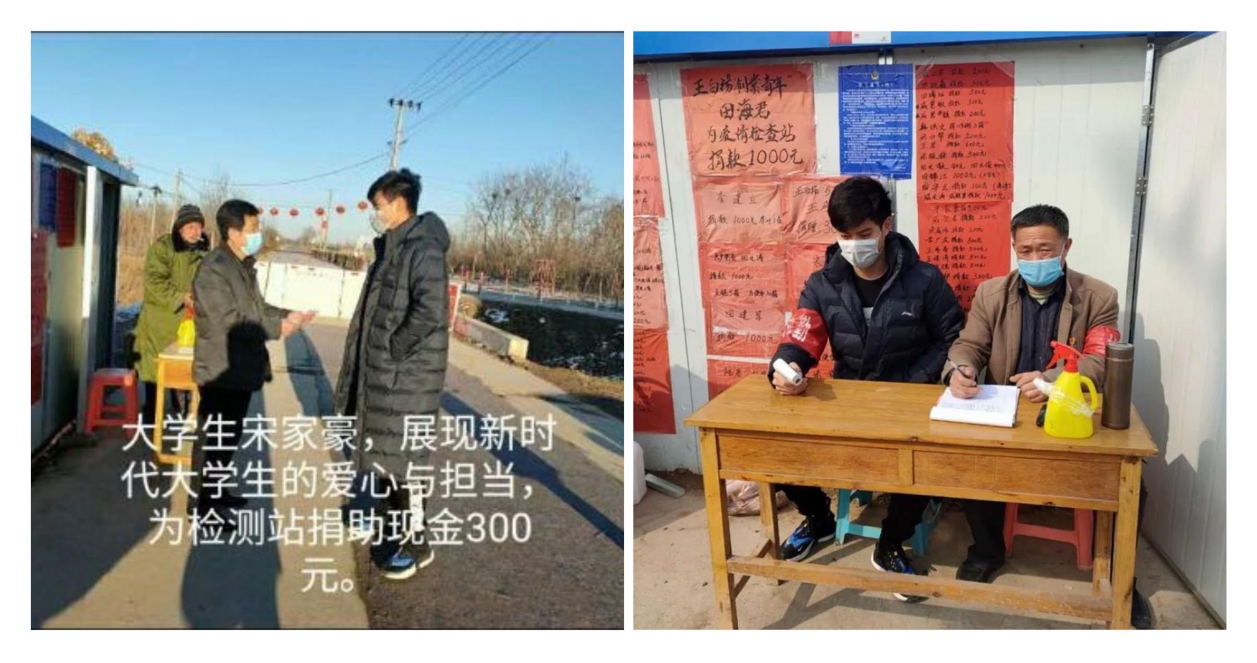 宋家豪讲到:在疫情发展关键时候,我也想为国家尽一份微薄之力,自发到家乡防疫站,向防疫站捐赠了现金300元,之后又和朋友自发在防疫站进行义务执勤,参加家乡防疫站一些基础工作,对出入的人流测量体温,来者进行登记,对外来物品进行消毒,帮助运送生活必需品,期间政府发放下来的消毒液到了我们防疫站,我对我负责的区域进行挨家挨户的发放消毒液和医用酒精。在执勤期间和朋友一直在防疫站外面岗位上坚守,虽然又冷又累,但想到能为国家多尽一份自己的力量,就能早一点战胜疫情!