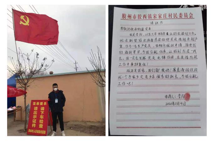 李阳是山东省青岛市胶州人,对家乡有着深厚的感情,密切关注着疫情的变化。作为一名中国共产党员,李阳主动请缨,向胶西镇政府提交请战书请求分配工作。在岗位上,他对出入人员进行及时的登记,测试体温,尤其是严格检查外来人员,对一些无故出入人员进行劝返。用他的实际行动为家乡贡献自己的力量,同时也展现了一名共产党员、一名山大体院学子勇于担当的家国情怀。