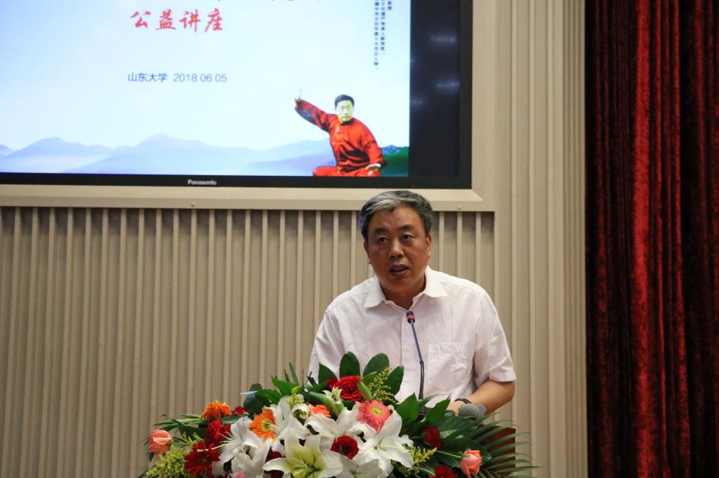 讲座伊始,仝兴华致欢迎词。他首先代表山东大学向陈小旺一行的到来表示热烈欢迎。他讲到习近平总书记在党的十九大报告中提到要“广泛开展全民健身活动,加快推进体育强国建设”,而太极拳在中国已有十分悠久的历史,既可强身健体,又能促进身心健康发展,同时在发扬中华优秀传统文化中发挥了积极作用。仝兴华表示山东大学历来重视群众体育工作和师生体质健康,太极拳运动在山东大学有浓厚的群众基础,太极文化对于学校体育工作起到了积极促进作用。最后,他希望伴随着本次讲座的成功举办,陈小旺老师能为推动我校武术专业发展和群众体育工作做出更大贡献。