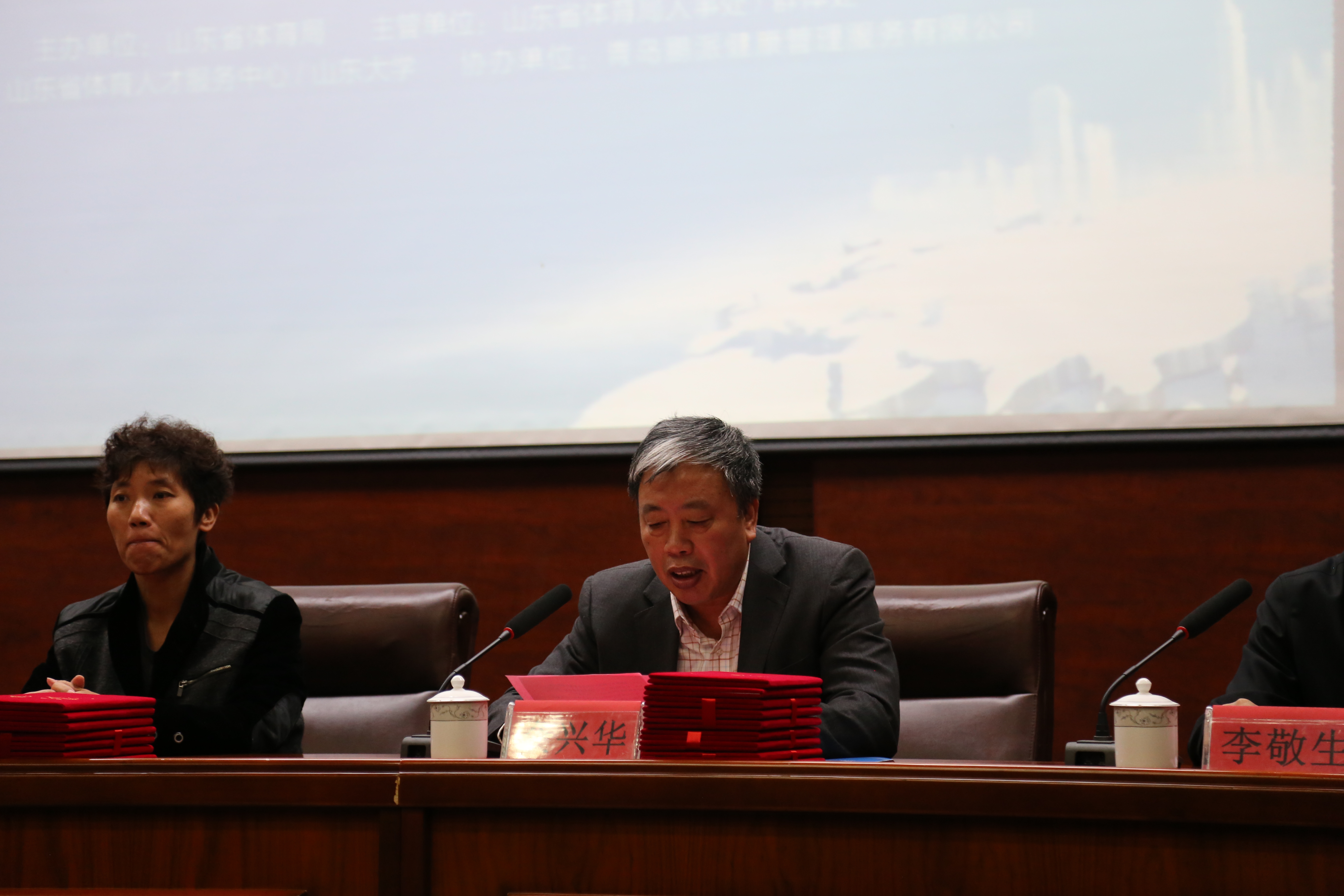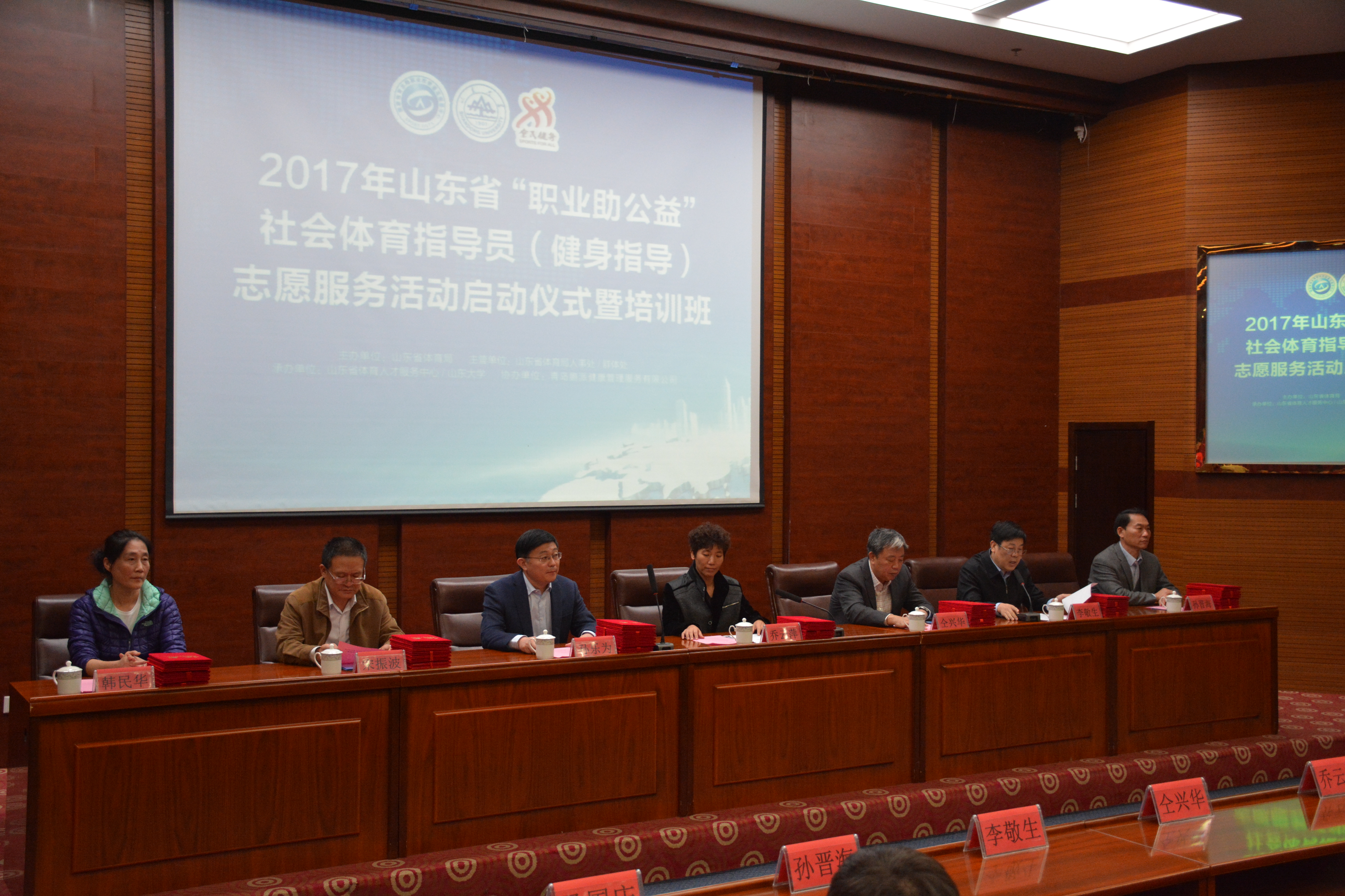 10月12日,2017年山东省“职业助公益”社会体育指导员(健身指导)志愿服务活动启动仪式暨培训班在山东大学中心校区举行。山东省体育局副局长乔云萍、山东大学党委副书记仝兴华出席启动仪式并讲话。启动仪式由山东省体育局人事处处长李敬生主持。