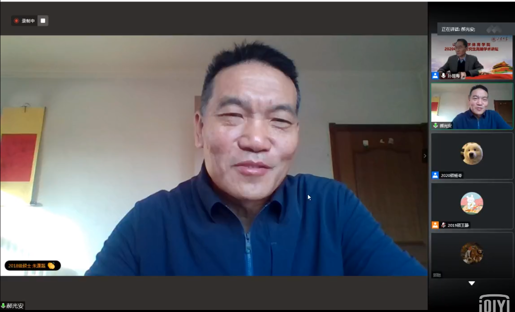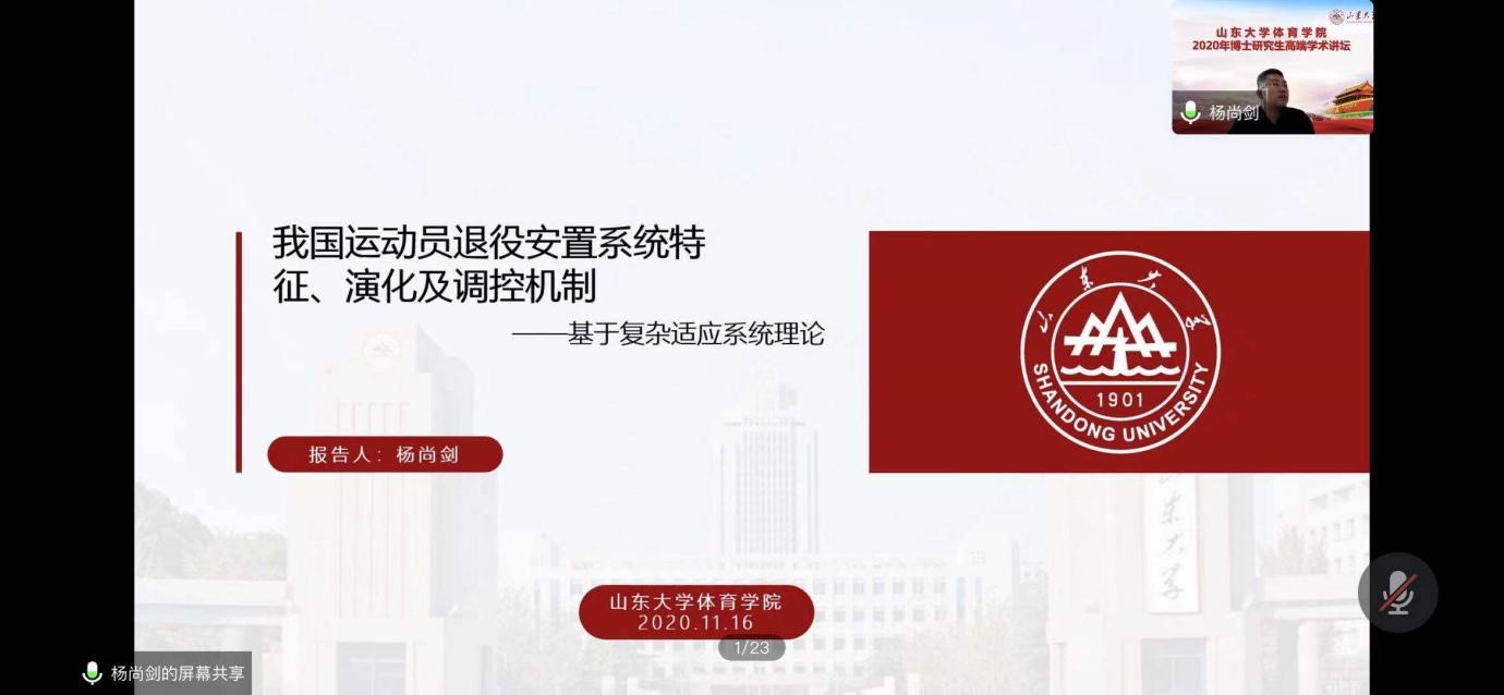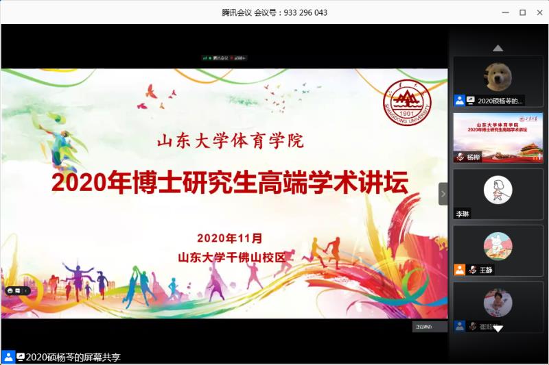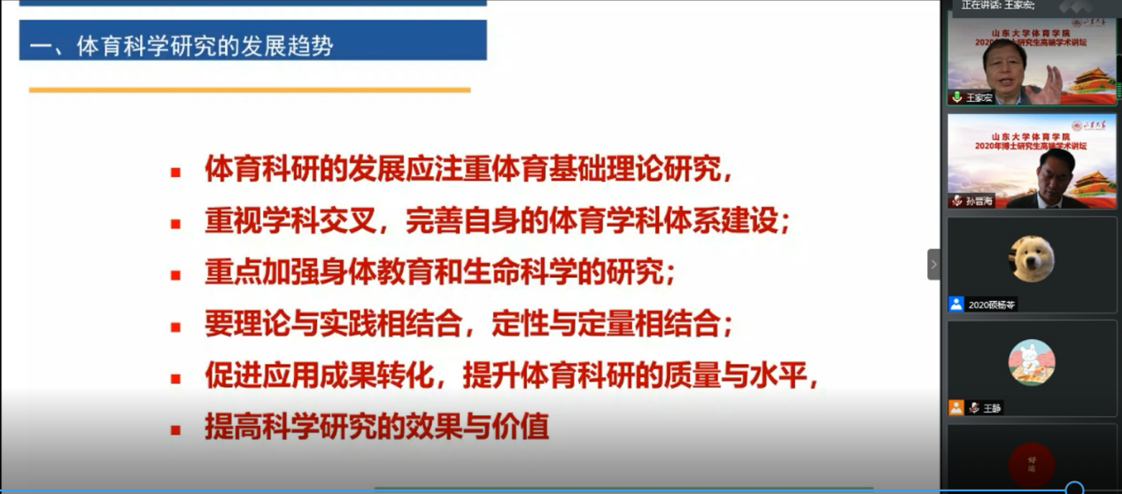 11月16日,我院举办的“2020年博士研究生高端学术讲坛”落下帷幕。本次学术讲坛邀请了多位国内知名专家学者,围绕体育哲学社会科学研究现状与发展趋势、健康与人格培养相融、体育科研论文的撰写规范、体育学科的发展与体育科研的趋势、智慧健身综合服务的数字逻辑与应用实践、体育口述历史在中国、运动员退役安置系统特征、演化及调控机制-基于复杂适应系统理论等,开展了广泛而深入的学习研讨,旨在进一步提升我校体育学研究生的教学质量和科研水平,不断拓宽学生的学术视野。