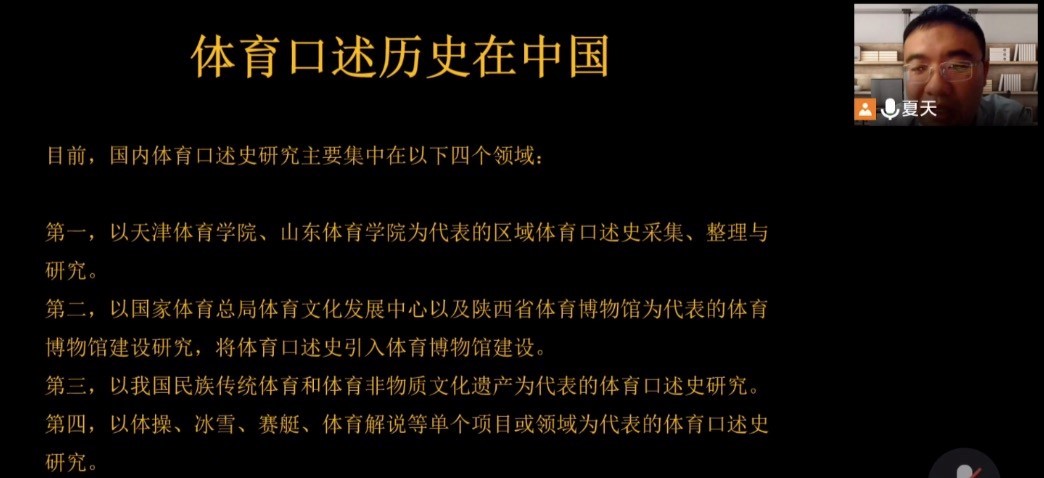 13日上午,北京体育大学池建教授和夏天博士应邀为学院师生作了题为“体育口述历史在中国”的学术讲座。池建教授和夏天博士分别给同学们带来了体育学、历史学和传播学的交叉学科盛宴。从口述史的定义谈起,回顾了中国体育口述史的源起与发展,阐述了体育口述史的价值,即体育口述史是体育史料的重要来源、是可以广泛运用于体育研究的重要研究方法、是体育文化建设的重要途径、是中国故事的最佳素材来源。并借助视频影像资料,让我们更加了解口述历史发展的必要性,以及借助口述历史口述来挖掘影响史料。同时,介绍了国内体育口述史研究主要集中的四个领域:区域体育口述史采集、整理与研究;将体育口述史引入博物馆建设;民族传统体育和体育非物质文化遗产为代表的体育口述史;以体操、冰雪、赛艇、体育解说等单个项目和领域的体育口述史。