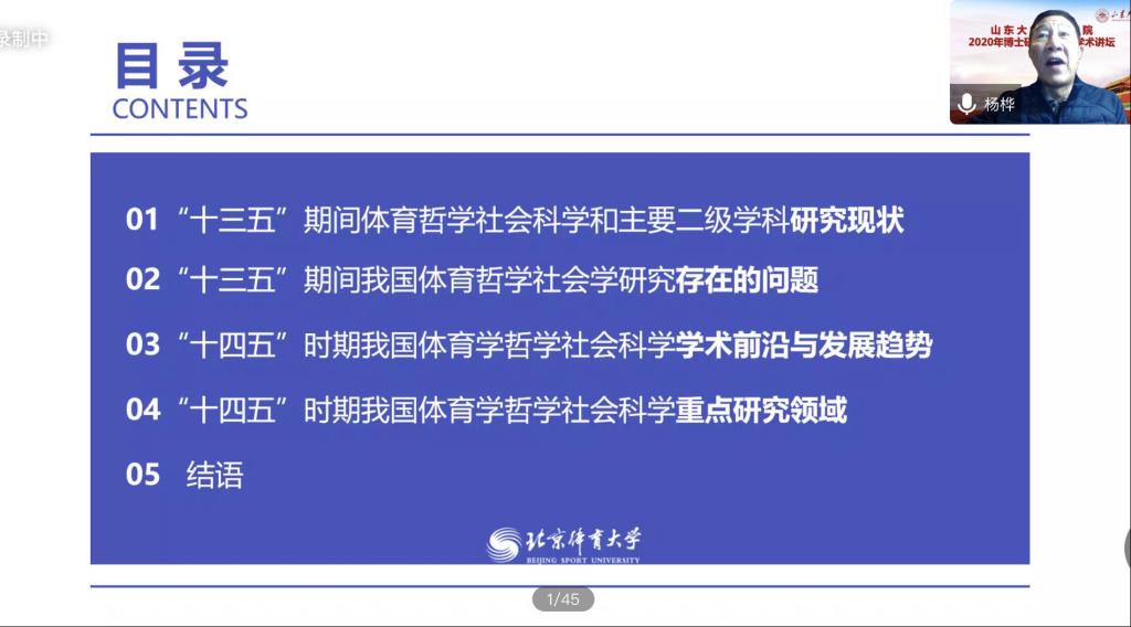 最后,孙晋海院长进行了总结,他说,杨桦教授是全国知名专家,能近距离聆听到大家的学术讲座,对我院师生来说荣幸之至,杨教授的讲座可以概括为“系统、全面、深入、细致、启发”,在较短时间内,为师生分享了我国体育哲学社会科学“十三五”研究现状,并高屋建瓴地预判了“十四五”的发展趋势和方向,让与会师生受益匪浅。他代表全院师生衷心感谢杨桦教授的倾囊相授,并且十分期待疫情结束后杨桦教授能到山东大学进行面对面的沟通交流。