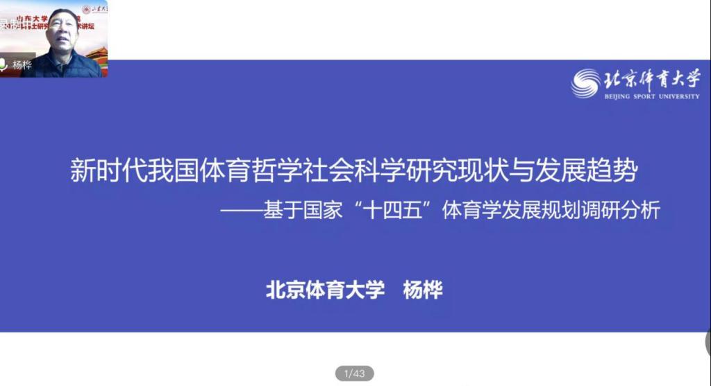 首先,杨桦教授就2016-2020年国家社科和教育部人文社会科学研究课题立项的数量、地区、出版著作和智库建设等方面进行总体介绍。他提出“十三五”期间体育学的二级学科日臻成熟,讲授了体育哲学、体育社会学、体育经济学、体育史学等学科的研究议题与进展,列举了在“十三五”时期取得的重大研究成果。其次,杨桦教授提出在“十三五”期间我国在体育哲学社会学的研究上还存在不足,比如成果转化率、学术原创力和体育学科建设等方面还有问题尚未解决。杨桦教授还对“十四五”时期体育学哲学社会科学将会发展的重点研究领域——国民健康素养与健康促进、健康中国建设与体育强国建设中的法律保障、健康中国和体育强国建设中体育的多元功能与价值等方面进行了详细地讲解。最后,杨桦教授全面概括了“十三五”时期体育学在国家哲学社会科学基金中的发展,为“十四五”时期体育学的建设和发展表明了方向。讲座结束后,参会师生就“十四五”期间在国家从全面建成小康社会到全面建设社会主义现代化国家背景下体育学科的走向、后疫情时代体育产业未来发展、体教融合以及体育文化繁荣与发展等问题进行交流。杨桦教授都耐心地对每个问题作出了详细的解答,现场交流气氛十分热烈。