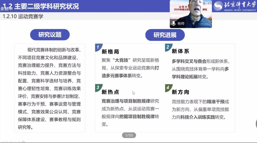 11月3日,2020年度环球360会员登录“博士研究生高端学术讲坛”顺利召开。第一场学术讲座邀请到原北京体育大学书记、 校长、博士生导师杨桦教授担任本次讲坛主讲嘉宾。通过腾讯会议,杨桦教授以“新时代我国体育哲学社会科学研究现状与发展趋势——基于国家‘十四五’体育学发展规划调研分析”为主题进行分享。讲坛由环球360会员登录党委书记、院长孙晋海主持。