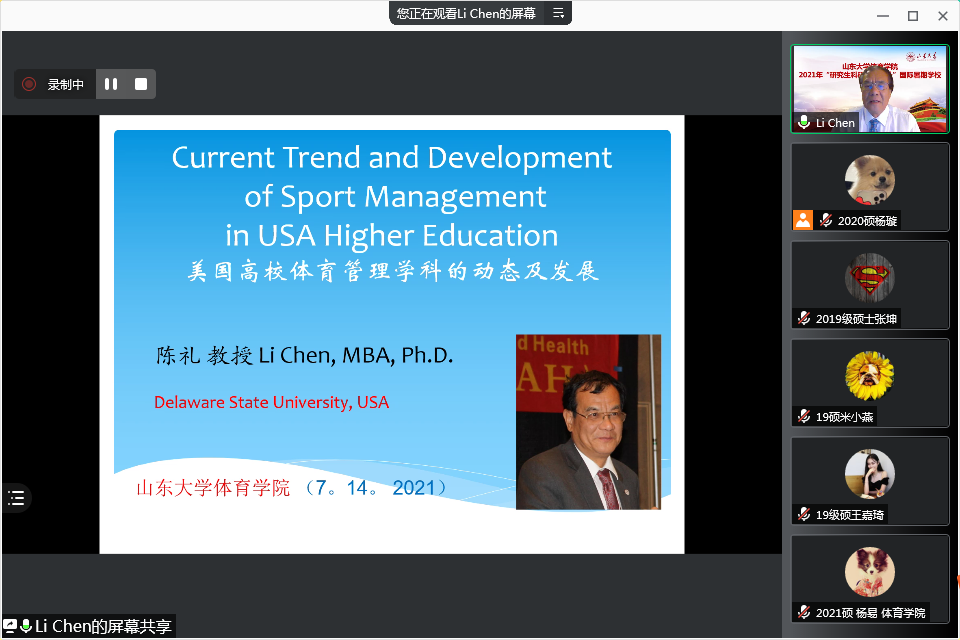 7月14日上午,美国特拉华州州立大学终身教授陈礼教授受邀作了以《美国高校体育管理学科的动态及发展》为题的学术讲座。陈礼教授在阐述美国体育人文管理学科的类型与结构、体育管理学科在北美及全球的分布、美国开办体育管理学科的高校数量及层次、美国高校的科研中心和合作、体育管理学科认证、工商管理学科认证、体育管理学科学术热点和国际期刊的基础上,对美国高校体育管理学科人才学用结合的培养理论进行了分析,并详细论述了体育管理学科所属院系的变化及趋势、体育管理学科的课程设置、特色学科的培育等问题。