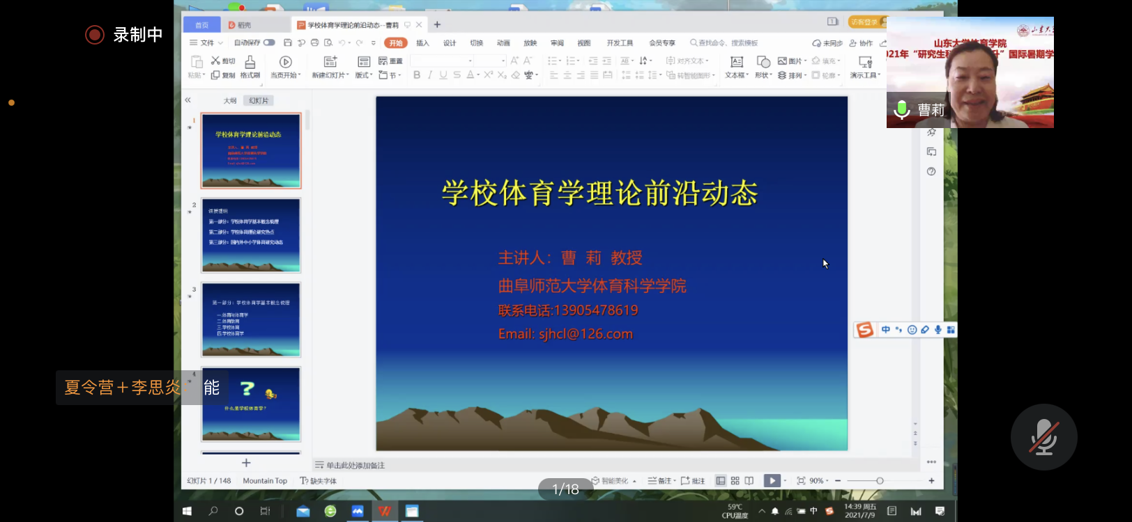 7月9日下午,曲阜师范大学体育科学学院院长曹莉教授做客环球360会员登录暑期学校,她以《学校体育学理论前沿动态》为题,从学校体育学基本概念梳理、学校体育理论研究热点和国内外中小学体育研究动态三方面展开讲座内容。曹莉教授认为现阶段学校体育应加强体育锻炼与学习、品质、心理等关系研究,进一步强化实用的体育课教学改革研究,开展好校园足球、篮球等活动,开发好校本课程,实现课内课外一体化、体育活动协会化、体育竞赛常态化。