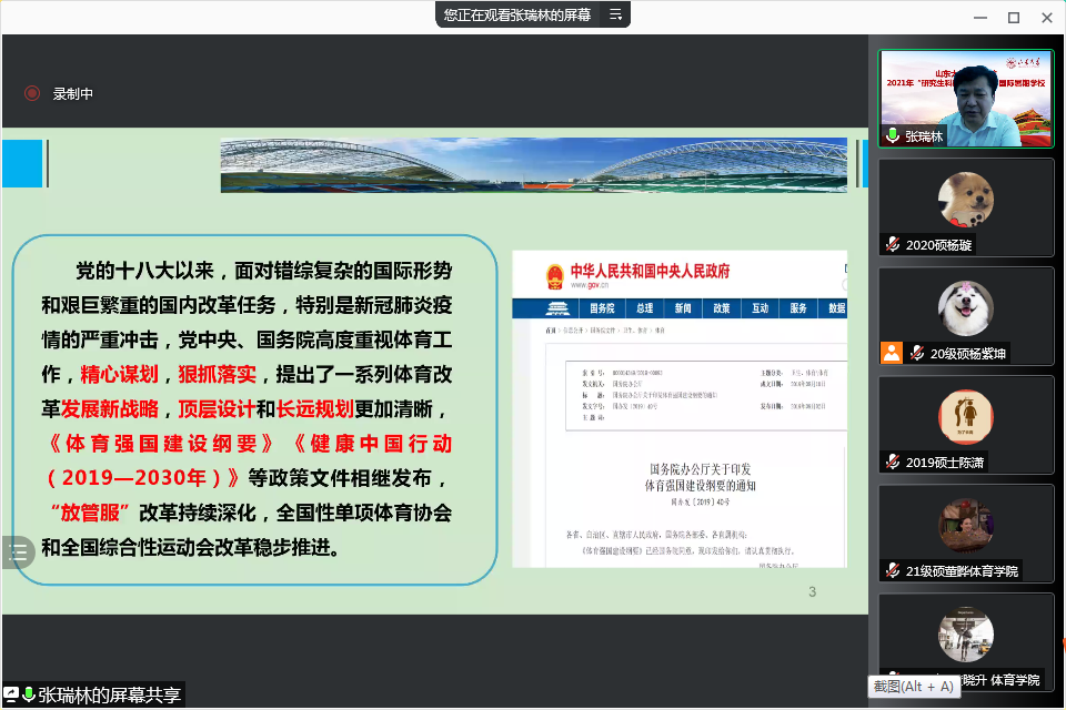 7月14日下午,吉林省体育局局长张瑞林教授做客环球360会员登录暑期学校,进行了以《体育强国建设视域中的我国“十四五”体育改革与发展》为题的专题讲座。张瑞林教授从“十三五”时期我国体育发展取得的成就讲起。他说道,我国全民健身国家战略已经深入实施,竞技体育也取得了斐然的成绩,青少年体育活动也在广泛开展,体育产业在国民经济中的地位和作用显著提升,体育文化在培育社会主义核心价值观中作用越来越凸显,体育对外交流与合作日益扩大。接着,张瑞林教授对未来“十四五”体育的改革与发展进行了系统的讲解。最后,张瑞林教授就学员们所提出的问题一一进行了解答和交流。