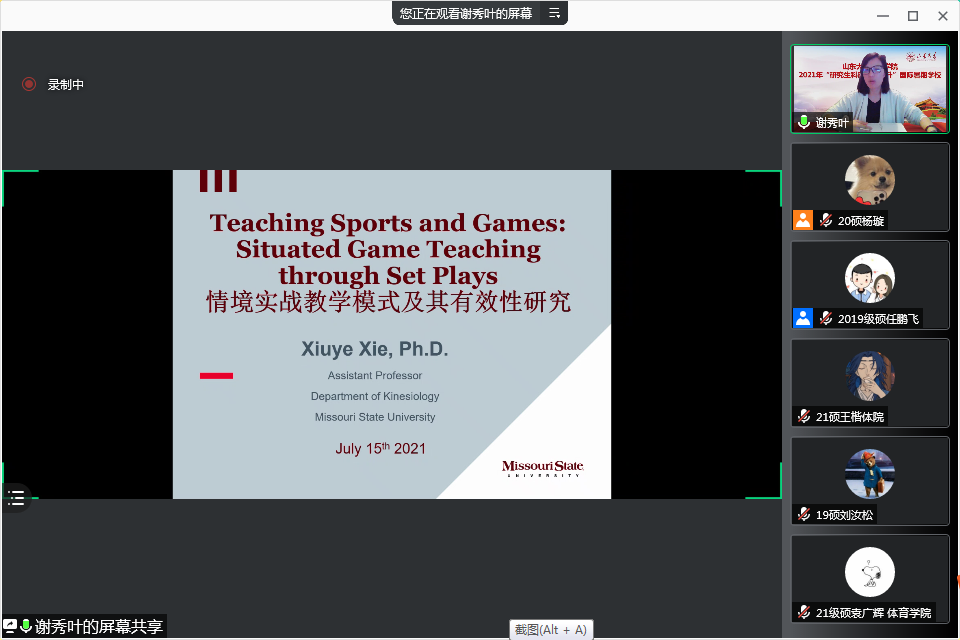 7月15日,环球360会员登录优秀校友,2014届硕士研究生、密苏里州立大学助理教授谢秀叶博士受邀作了题为《情景实战教学模式及其有效性研究》的主题讲座。谢秀叶博士说明了该讲座的主题背景及形式,她讲到其相应的研究主要是关于教学模式的提出、教学模式有效性的验证、教学模式在不同年级和不同体育运动项目的应用和研究。接着,谢秀叶博士从提出的三个问题进行导入,她请学员们思考“体育教学的目标是什么”、“学生的技战术能力是如何发展的”、“技术和战术之间的关系是什么”,引发学员深思。随后,谢秀叶博士从情景实战教育模式介绍、情景实战教育模式的应用与技巧和情景实战教育模式研究三个方面进行了详细的讲解,带来了精彩的学术讲座。