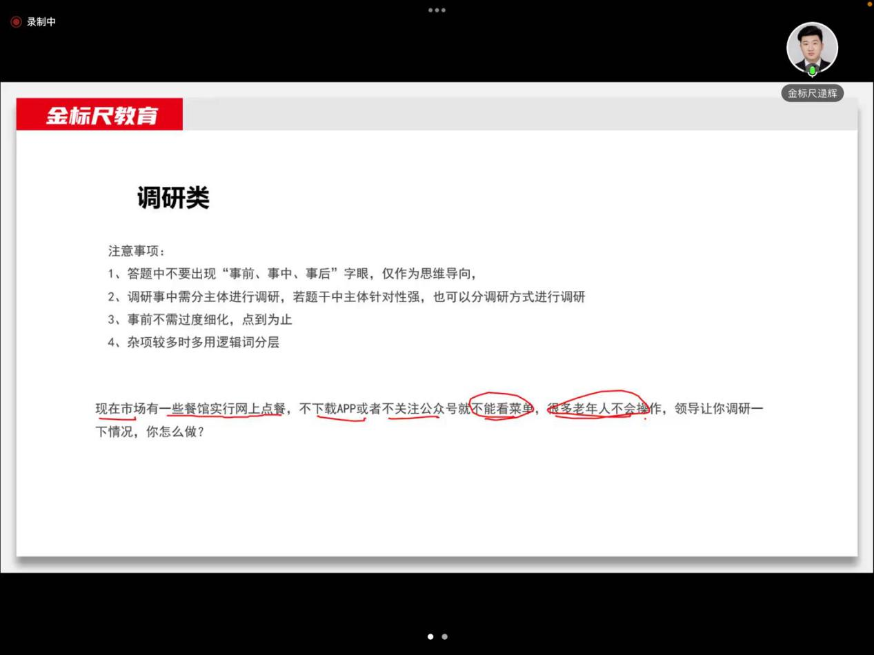 11日,逯辉着重讲解了面试中计划组织和应急应变两个方面。逯辉将计划组织分为调研类、宣传类、整改政治类、评比选拔类和接待考察类等等,提出针对不同的类别要遵循前期准备-中期开展-结果反馈的答题思路。应急应变主要包括临时会议发言、临时接待考察、临时举办会议等,逯辉认为要遵循先急后缓、先公后私、先人后物的原则进行回答。