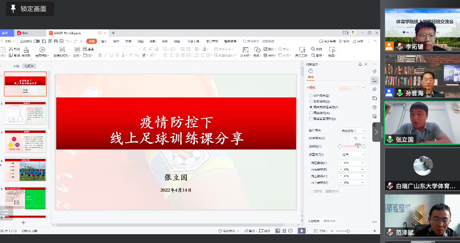 根据会议议程,崔丽丽、孙传宁、张立国3位教师进行线上教学经验交流。崔丽丽从熟练使用线上教学平台、完善课程教学设计及教学内容电子化、充分利用网络教学资源和师生配合互动4个方面向大家分享了自己在理论教学中的经验。孙传宁从公共体育篮球课线上教学的内容、方法等方面进行分享。张立国介绍了线上高水平足球队训练课的经验,从安排训练计划、创新组织形式、示范纠正指导、加强沟通交流等方面开展训练课。