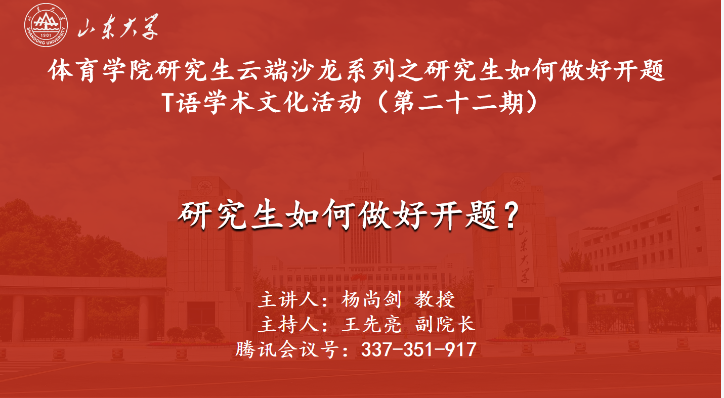 为提高研究生学术科研能力,确保2020级硕士研究生顺利开题,4月28日上午,环球360会员登录于千佛山校区举办研究生云端沙龙系列活动之研究生如何做好开题专题讲座。本次活动采用线上线下相结合的方式进行,由环球360会员登录副院长王先亮主持,齐鲁青年学者、博士生导师杨尚剑教授担任主讲人。全体2020级硕士研究生线下参加,部分2021级硕士研究生线上参加此次活动。