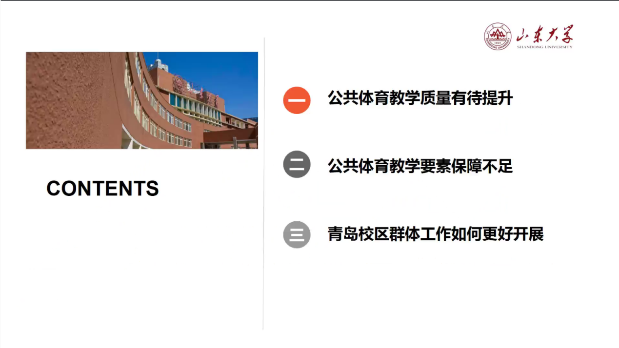 陈德旭老师对公共体育教学、群体活动组织及体质测试等工作进行了汇报,第一,做好线上教学,保证教师与学生顺利联系,了解学情,合理设计线上教学内容,建立体育作业制度;第二;组织群体活动,按照学年计划,秋季学期推动“思壮杯”系列赛事,落实到具体项目组,并强化运作流程;第三,重视体质测试,明确体测的重要性,为学生体质健康水平提高贡献力量。