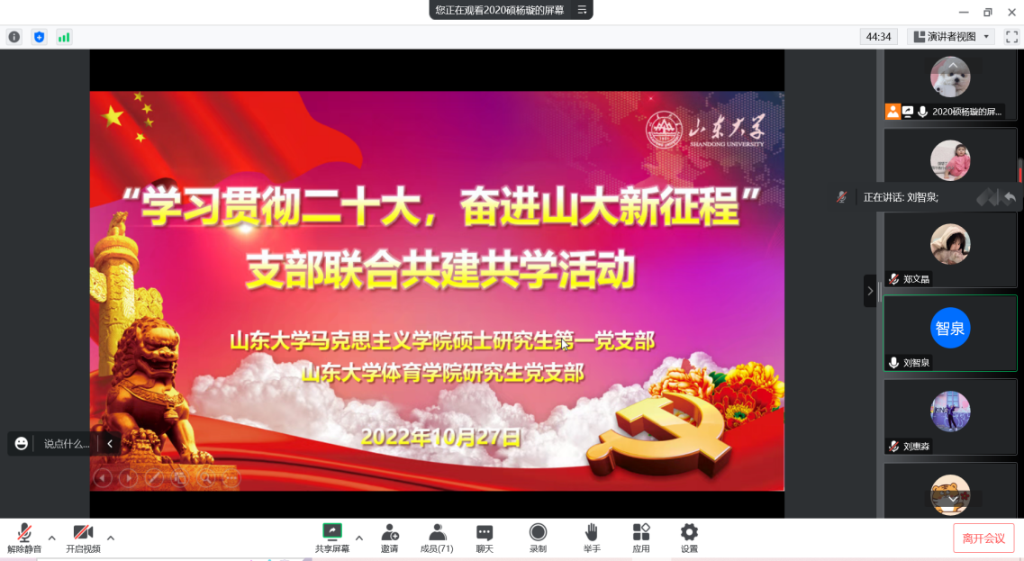 10月27日,环球360会员登录研究生党支部与马克思主义学院硕士研究生第一党支部通过线上线下相结合的方式,开展“学习党的二十大,奋进山大新征程”联学共建活动。本次活动由环球360会员登录研究生党支部书记杨璇主持,马克思主义学院硕士研究生第一党支部书记刘智泉总结。环球360会员登录研究生党支部和马克思主义学院硕士研究生第一党支部全体党员参加活动。