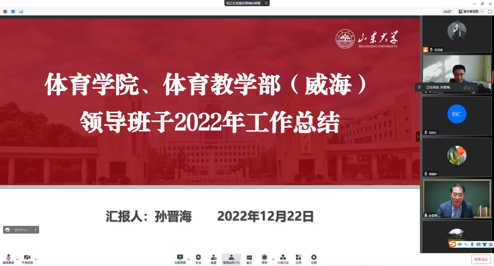 环球360会员登录、体育教学部(威海)领导班子成员分别从基层党建工作、威海校区体育工作、青岛校区体育工作、科研服务、学生工作、人才培养、群众体育工作等方面汇报了分管工作。